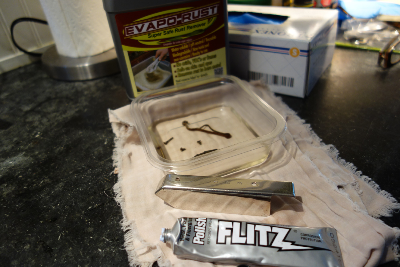 One of the first things I did was remove rusty parts a few at a time and throw them into an Evapo-Rust bath. Many of the plated parts were in bad shape with flaking plate (nickel? chrome?) and severe rust. I did the best I could to preserve as much of the plating as possible, following up rust removal with Flitz polish. Some pieces were down to bare metal, so I polished them with the dremel.