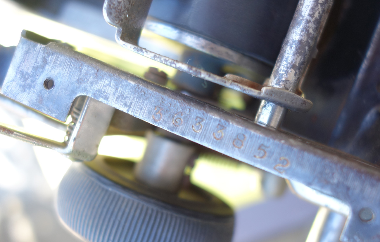 and a serial number stamped on the carriage under a cover plate and handwritten behind the paper table: #3633852
