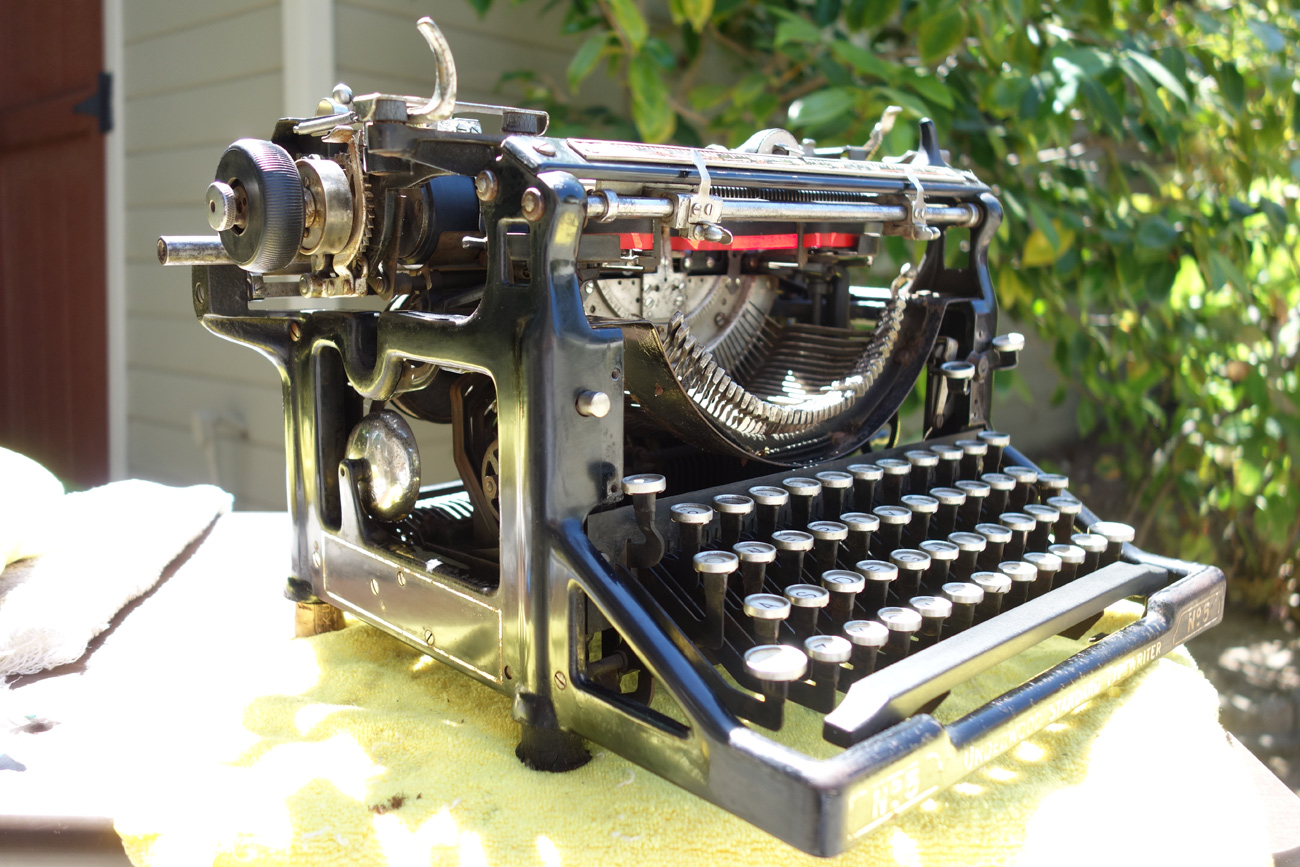 I have been spending many happy days outside by the garage working on the Underwood 5 for the young writer, Quin. When I first got it, I had doused the machine in Liquid Wrench penetrating oil to loosen the rust. That horrible burning smell persisted for days and days – working in the fresh air was necessary. Fortunately the weather was warm and pleasant, and I cleaned and tinkered and listened to the neighborhood children play and the neighborhood dogs bark.