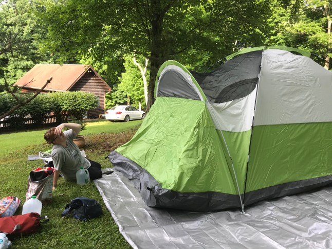 When I first got to Herman’s, I helped Kansas Typewriter (Alison D.) set up her tent for the night. It was enormous. The tent package said it could hold up to 40 Boy Scouts. Here is Alison swooning about halfway through the set-up: