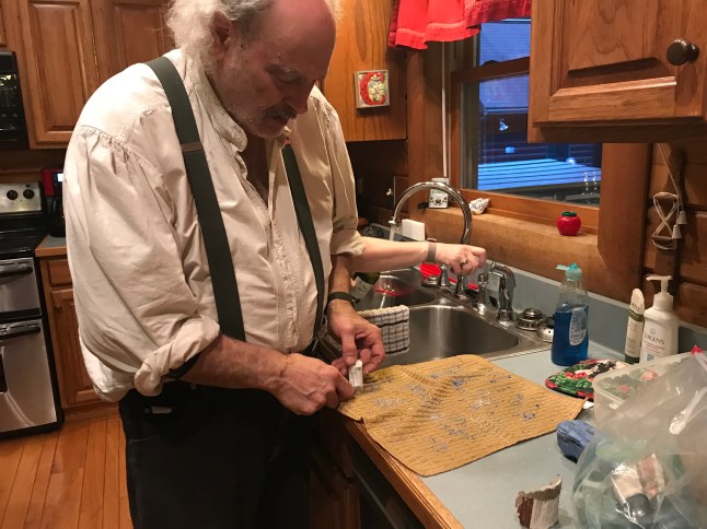 Herman’s wife had wisely skipped town while the Typewriter Jubilee was going down, and Herman’s friend Ginger stepped in to help out in the kitchen. Ginger eyed the cloth impregnation with some suspicion, but while Nicholas worked she told me about the 15 foot python that was terrorizing Sabraton. Ginger was mollified after Nicholas cleaned her sink and faucet area and polished it to a mirror finish with his impregnated cloth.