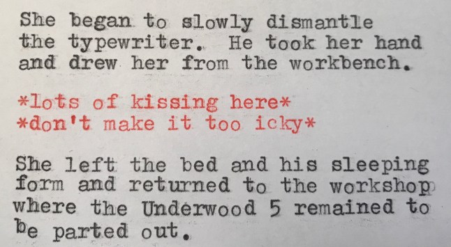 I’m making good progress on the Great American Novel, so this typewriter was a nice reward for my hard work. I had initially described my novel as a historical romance, but I think it’s more of a historical comedy. Or maybe a historical comedy-drama. I have the first draft completed, and gosh, it’s funny. The romance scenes are rough. I don’t know if I have the necessary mettle required for romance writing. Here is a sample love scene in the current draft: