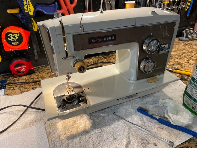 My sister has a Kenmore too. You really can’t go into a thrift store without tripping over a Kenmore 158 or two. Replacement parts for these 50-60 year-old machines are easy to find at various online shops or eBay. My sister road her Kenmore 158 so hard she broke the foot controller. No worries! She found replacement parts and was back in business.