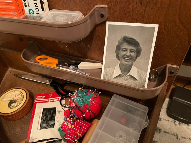 When I brought the machine home, I found a stray photo in the notions box. I think this may be the original owner, the mother of the men who sold me the machine. I keep her inside my cabinet and she inspires me while I sew.