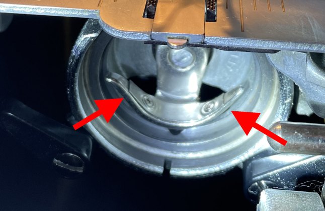 Now this thing truly runs like butter. Though it was sewing flawlessly, it had a rattle because there was too much play in the shuttle hook area. I saw that I had a broken shuttle driver spring: