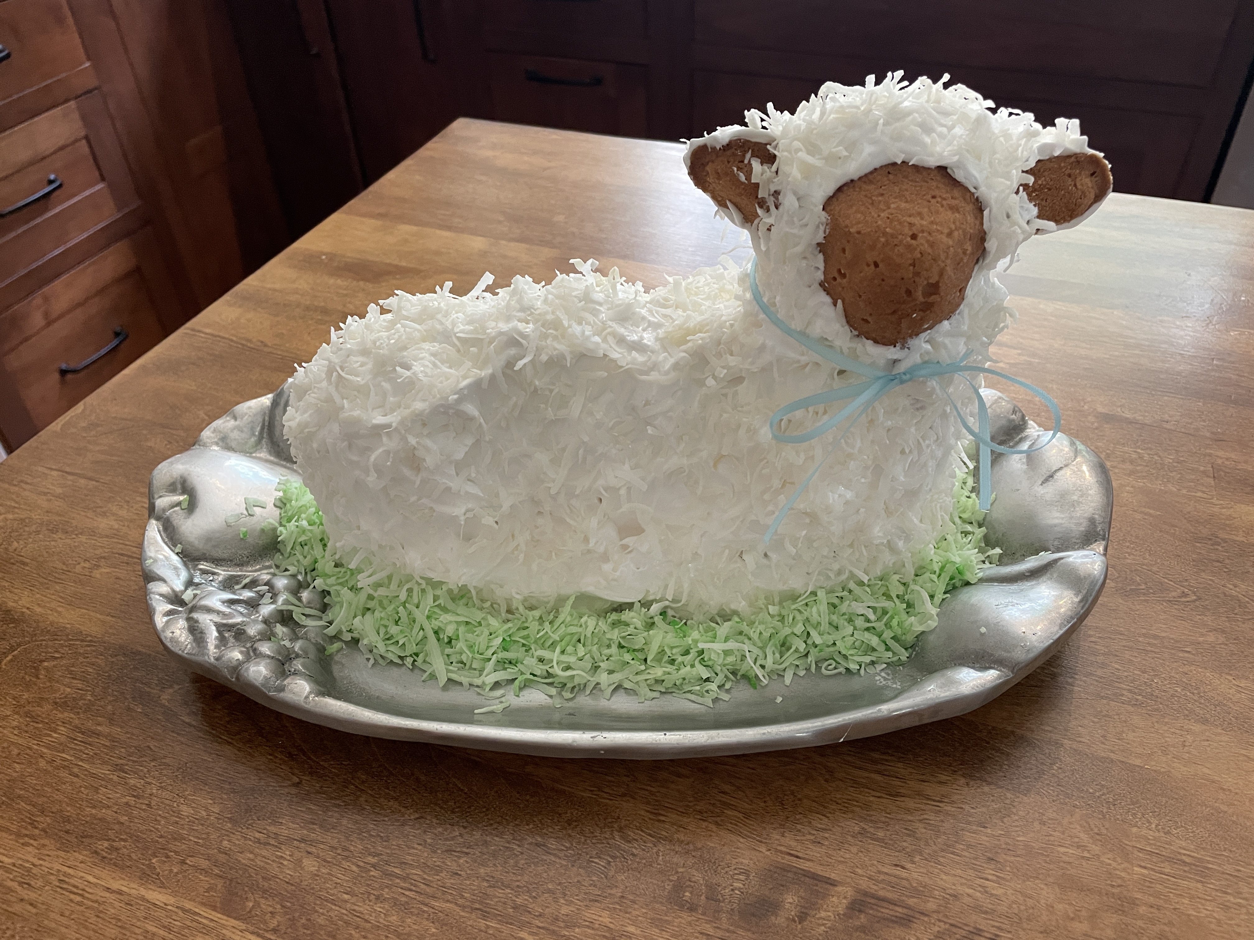 Speaking of challenging archaic technology, I am The Keeper of the family lambie cake mold, and it is my responsibility to create the Easter lambie cake each year. It’s a highly technical, two-day process, fraught with expected and unexpected challenges.  My go-to lambie cake resource is RetroRuth’s Mid-century Menu.