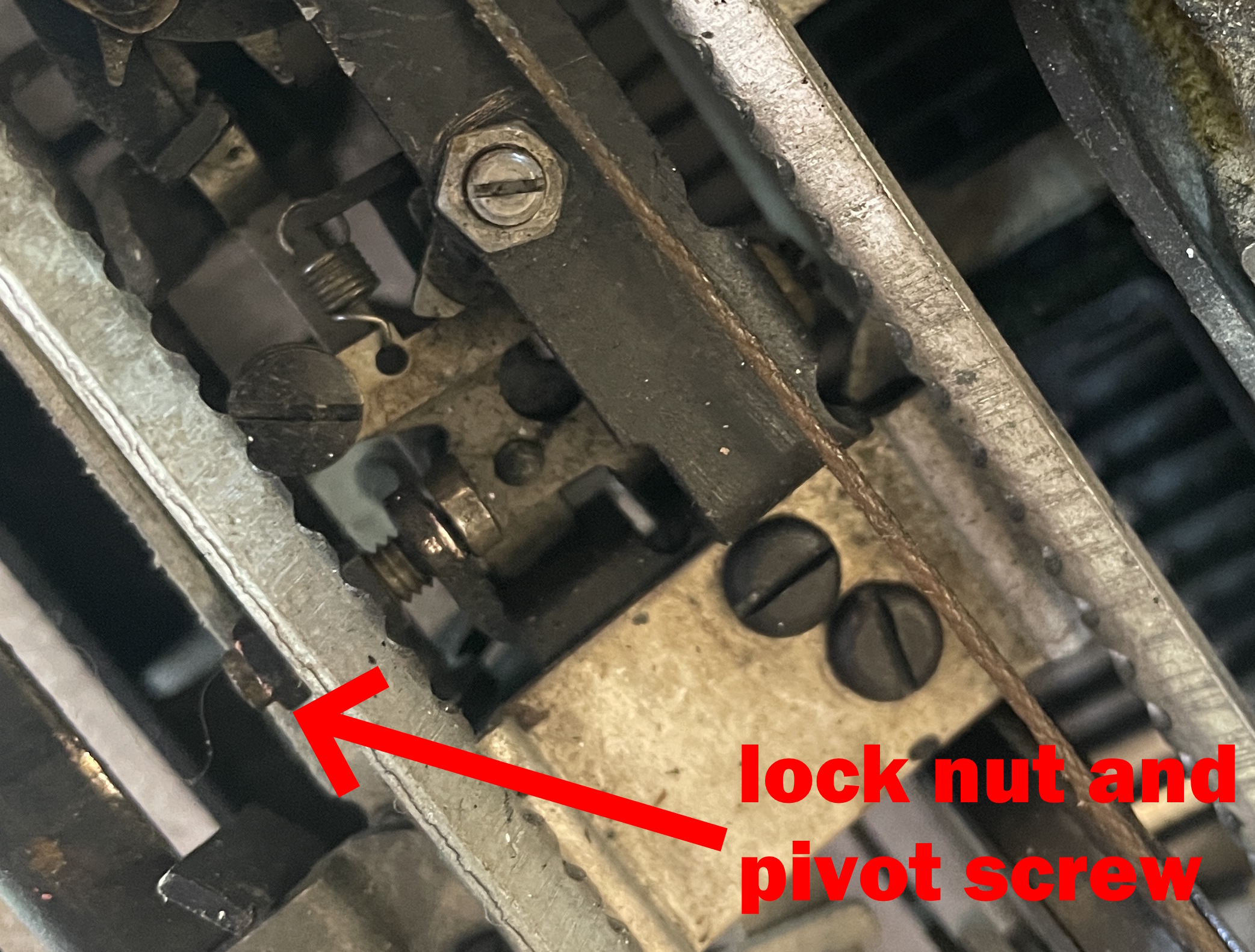 With the carriage off, the escapement plate is easy to access. You’ll need to loosen a barrel-shaped lock nut and pointy tip screw that the escapement plate pivots on. I have a very krappy set of metric mini tools and the 5mm nut driver seemed to work okay on the lock nut.
