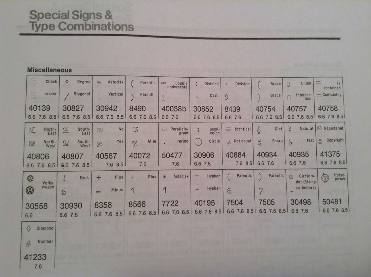 I particularly love the manuals’ type and special characters sections. Here’s a pleasantly confusing mashup typeface I’d like to own: