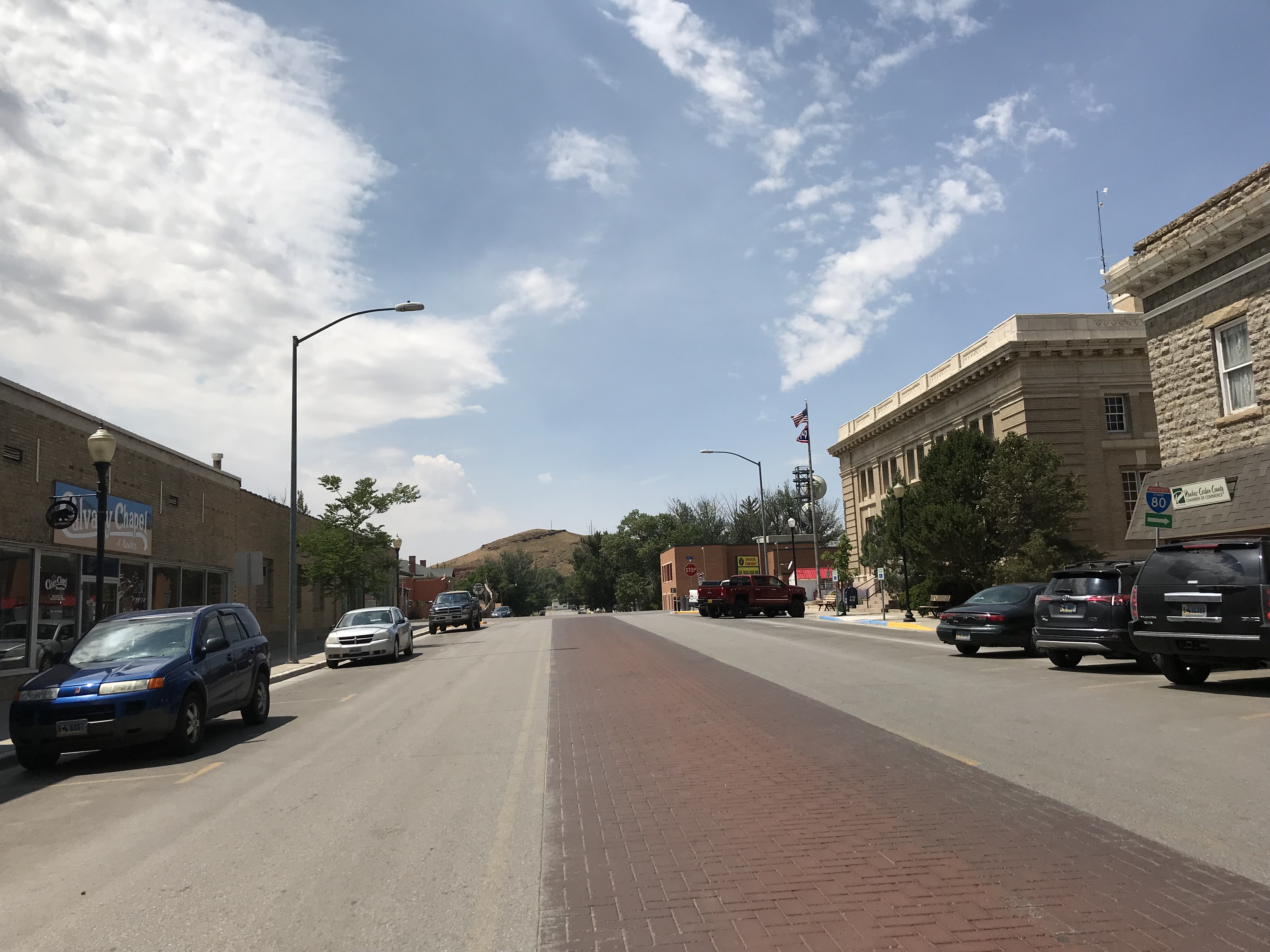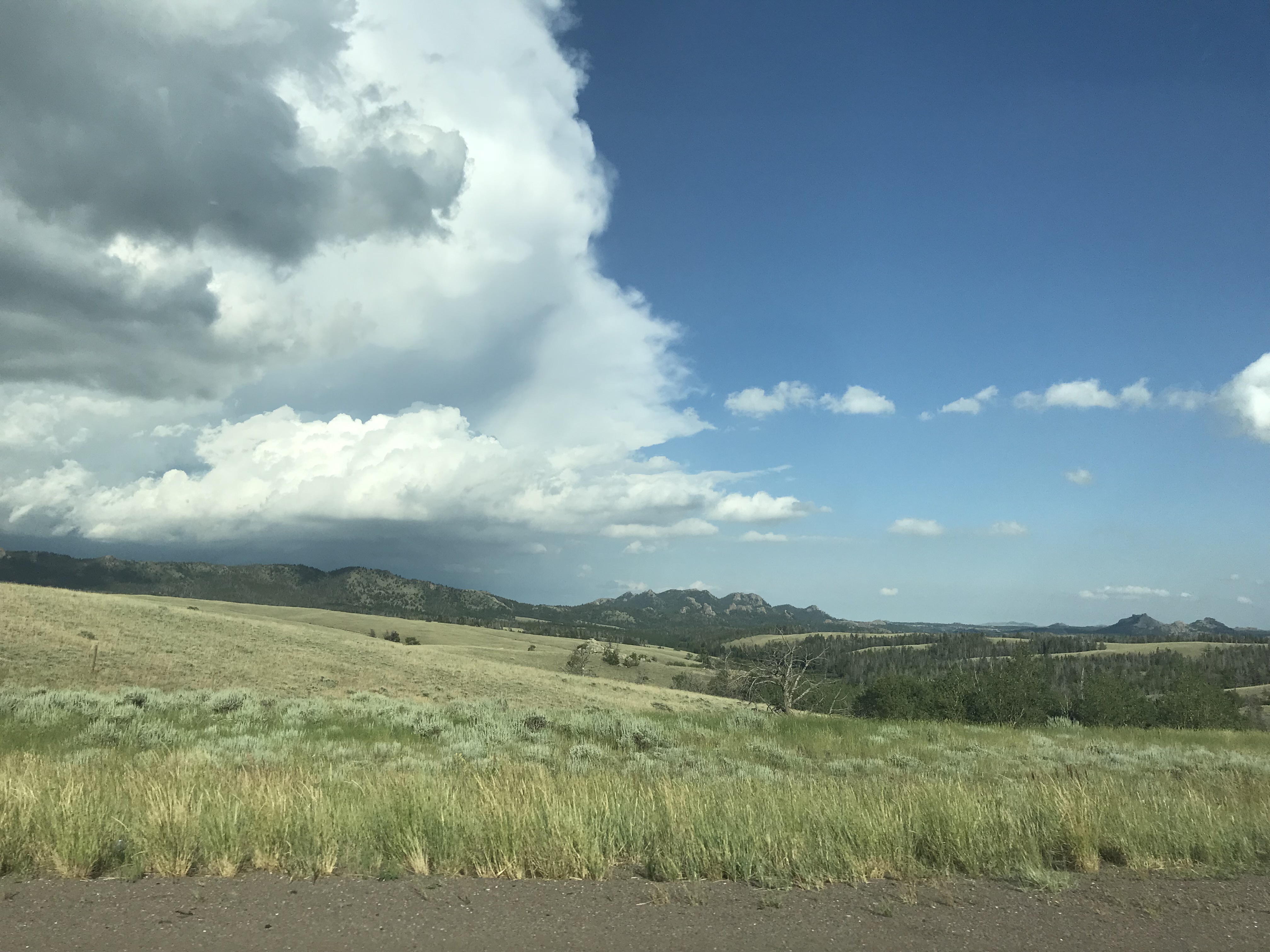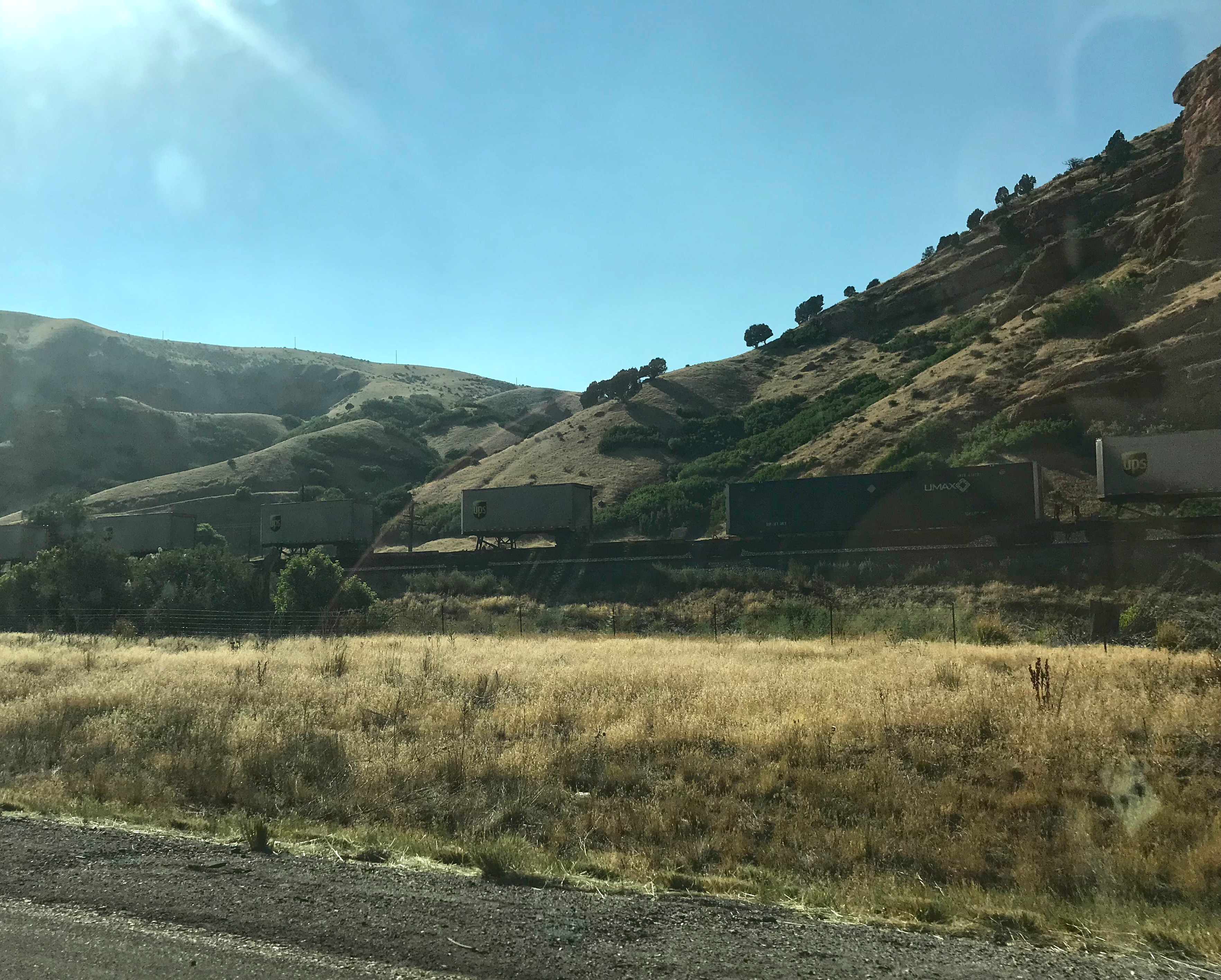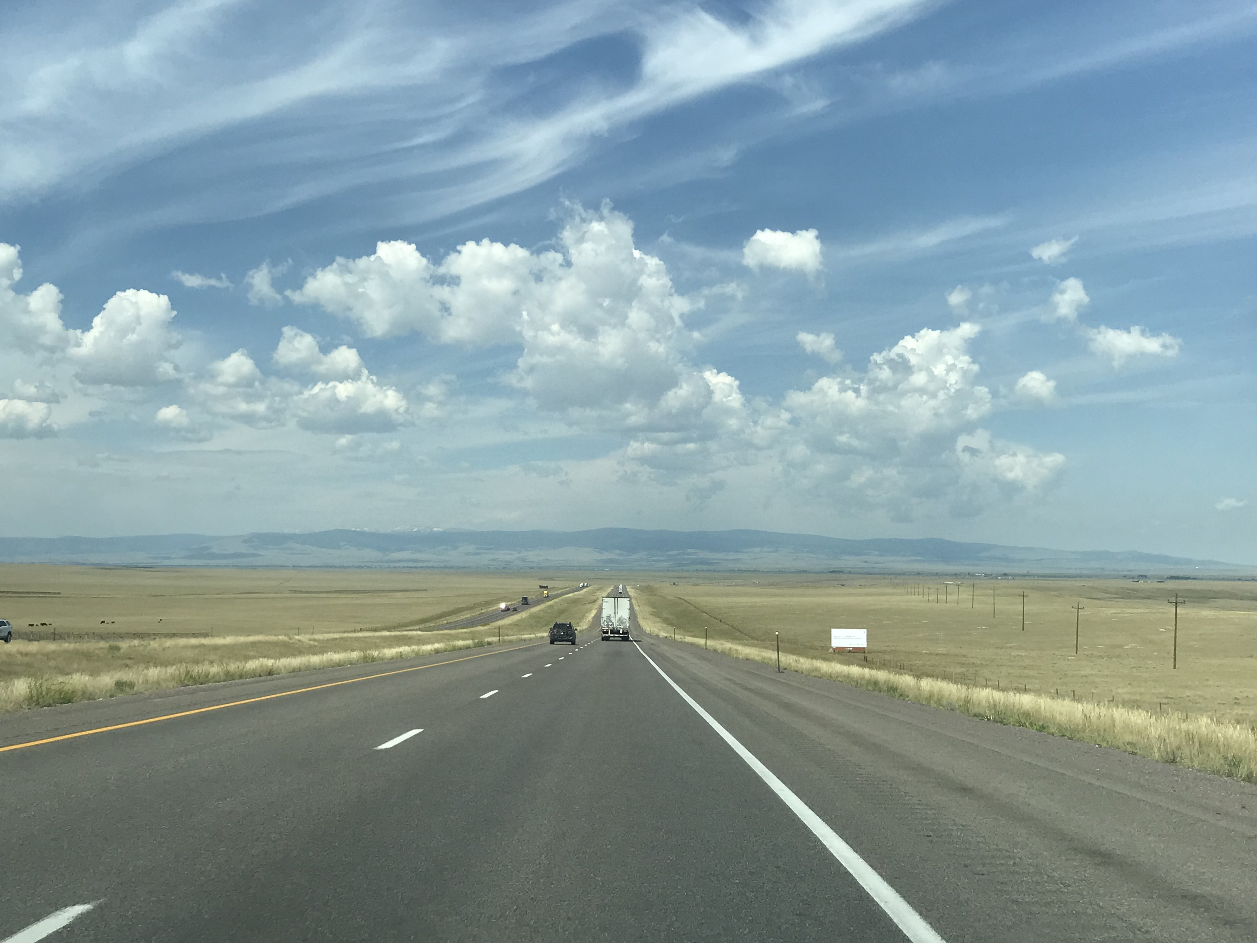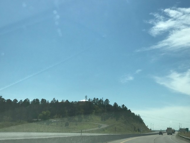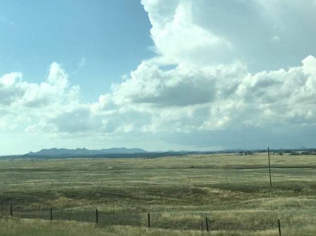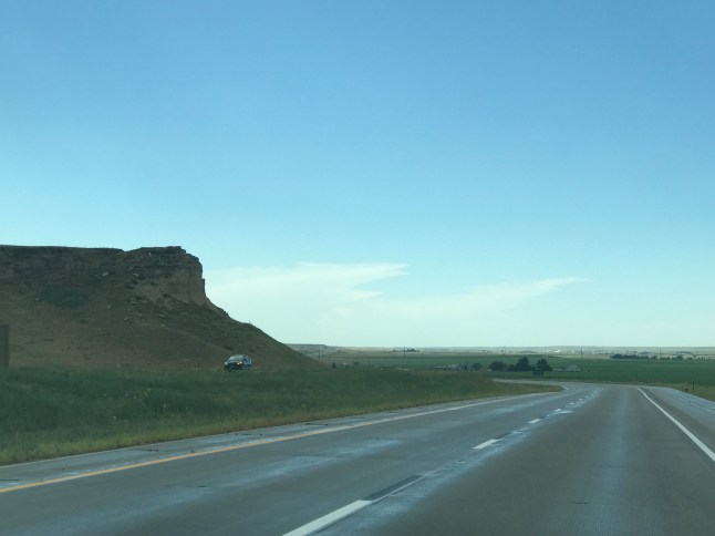 We hopped in the car and headed west.  See those snow covered peaks way off in the distance? Those are the Rocky Mountains.  That’s the only time we saw snow covered peaks all day.  Instead we ascended to high flattish-lumpy desert that got progressively more barren as we climbed.