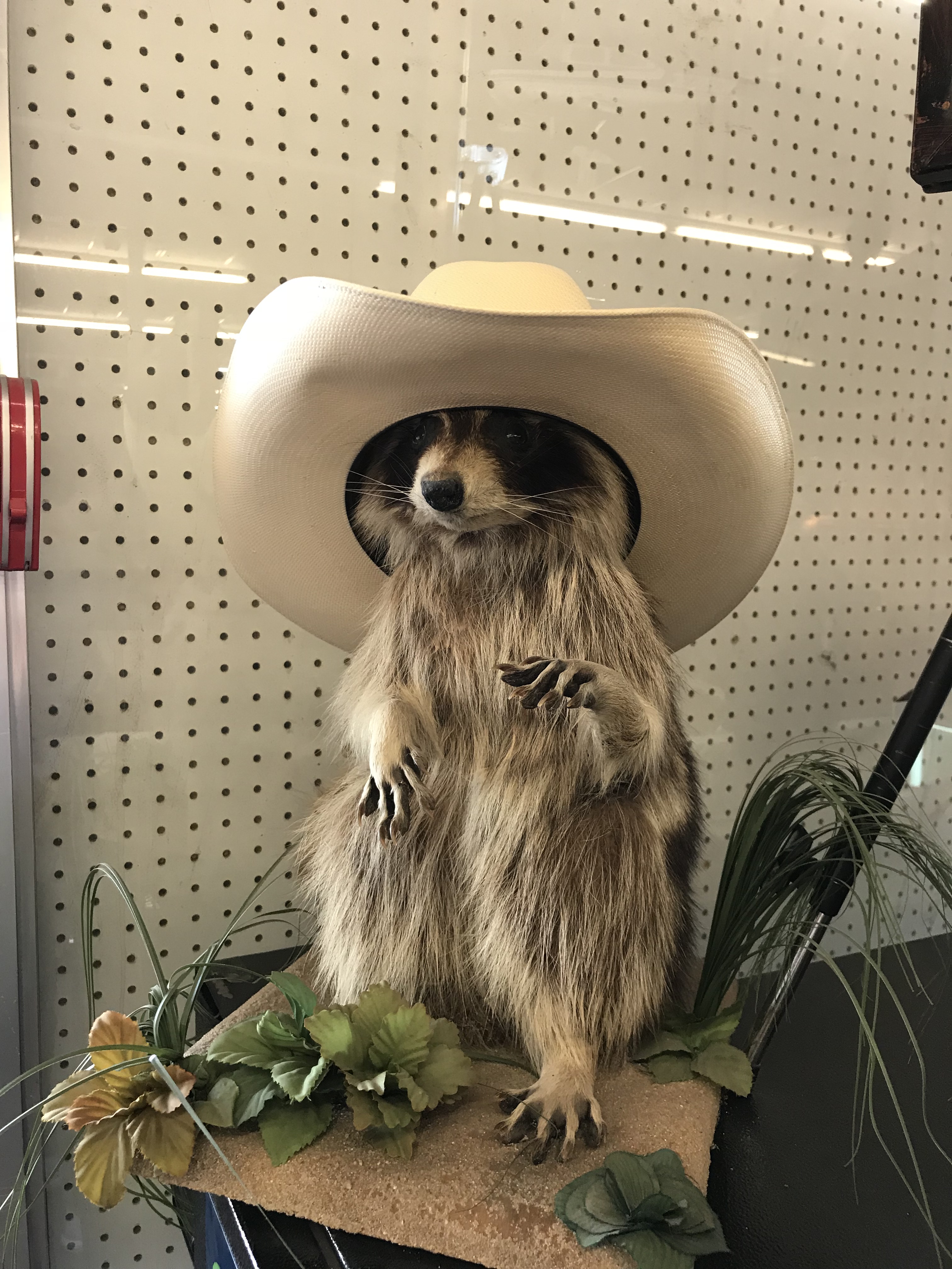 We were greeted at the door by a raccoon: Howdy, pardner!
