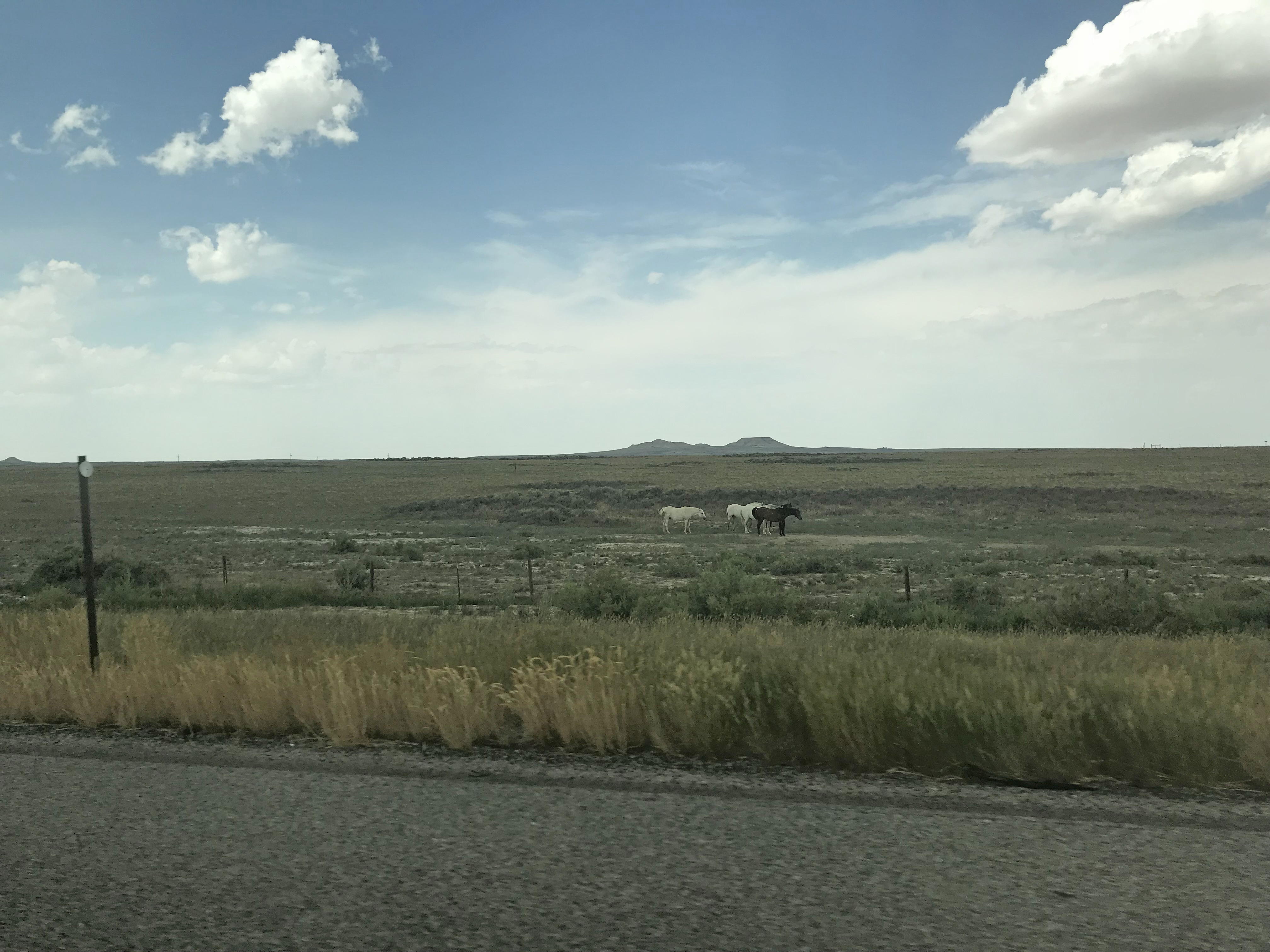 Up, up, up we went and it became increasingly arid. Alkalai flats and sagebrush began to appear. We saw groups of pronghorn antelope.  Sadly no pictures of the pronghorn, but here are some desert horses hanging out.